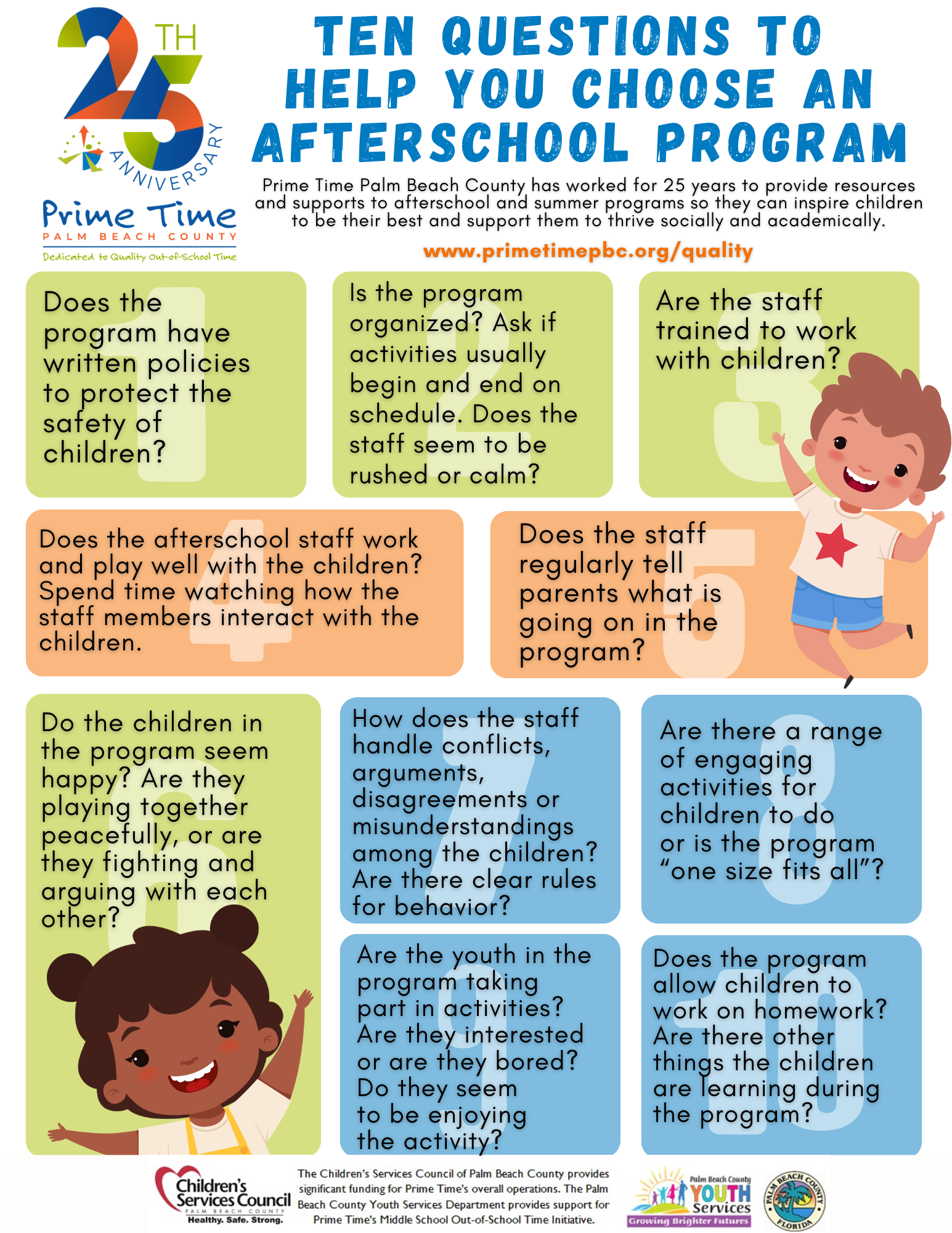 Prime Time Palm Beach County (PTPBC) is a nationally recognized nonprofit dedicated to ensuring that every child and youth has access to high-quality out-of-school time (OST) programs that support their academic, well-being and lifelong success. Prime Time provides resources and supports to afterschool and summer programs in Palm Beach and Martin Counties to help deliver high-quality programming that allows children to thrive socially and academically.